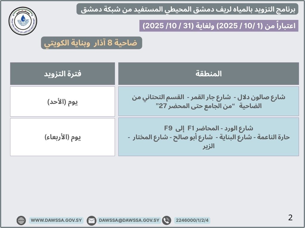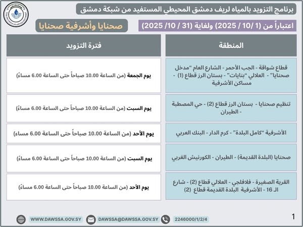 برنامج التزويد بالمياه لريف دمشق اعتباراً من 2025/10/1 ولغاية 2025/10/31