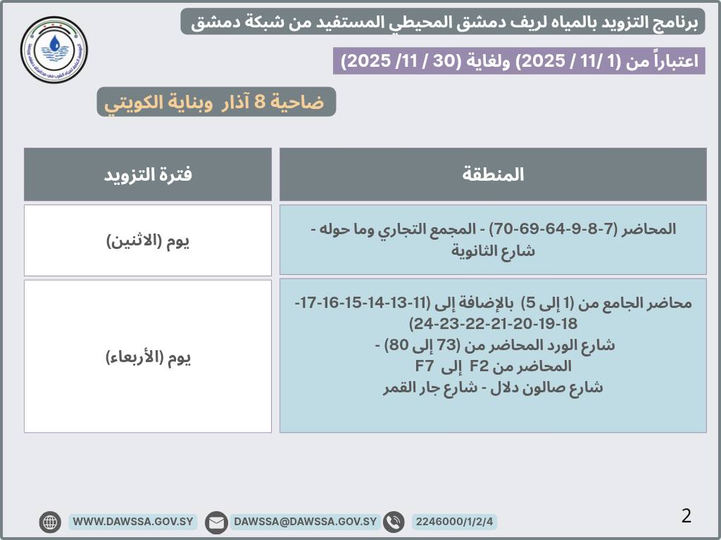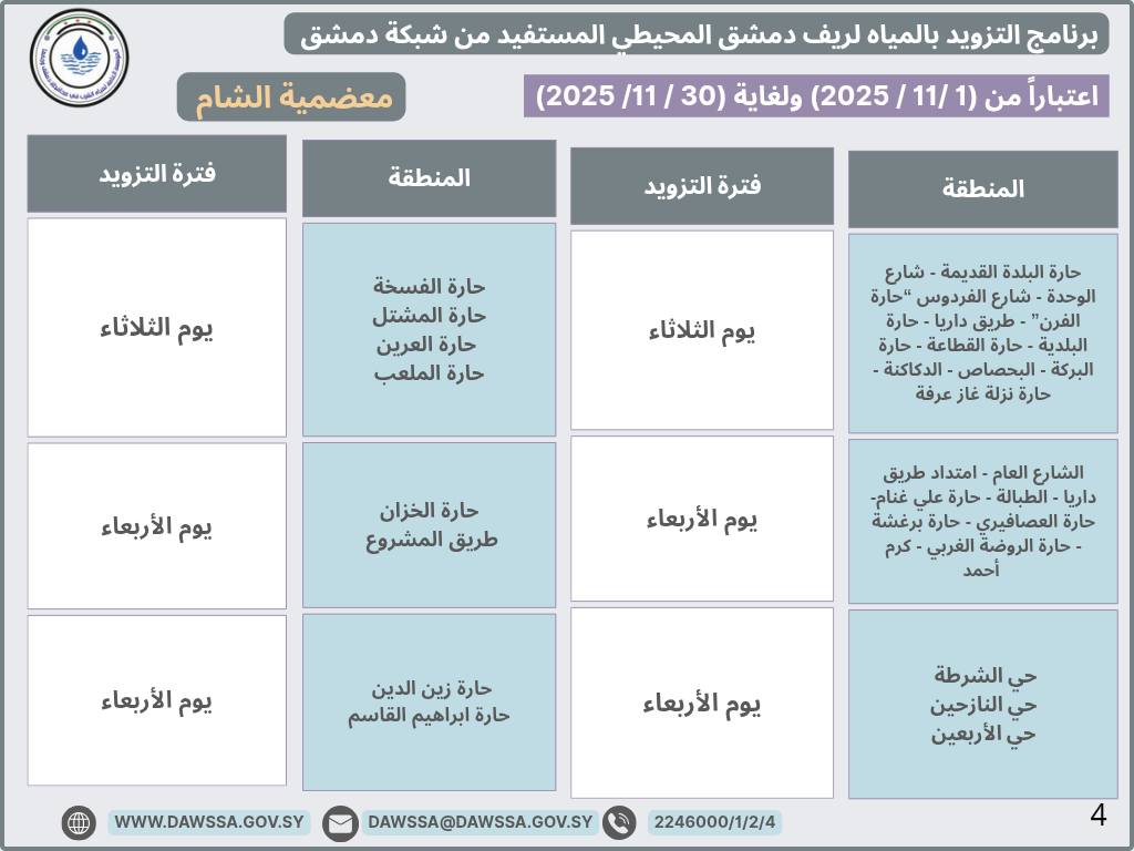 برنامج التزويد بالمياه لريف دمشق اعتباراً من 2025/10/1 ولغاية 2025/10/31