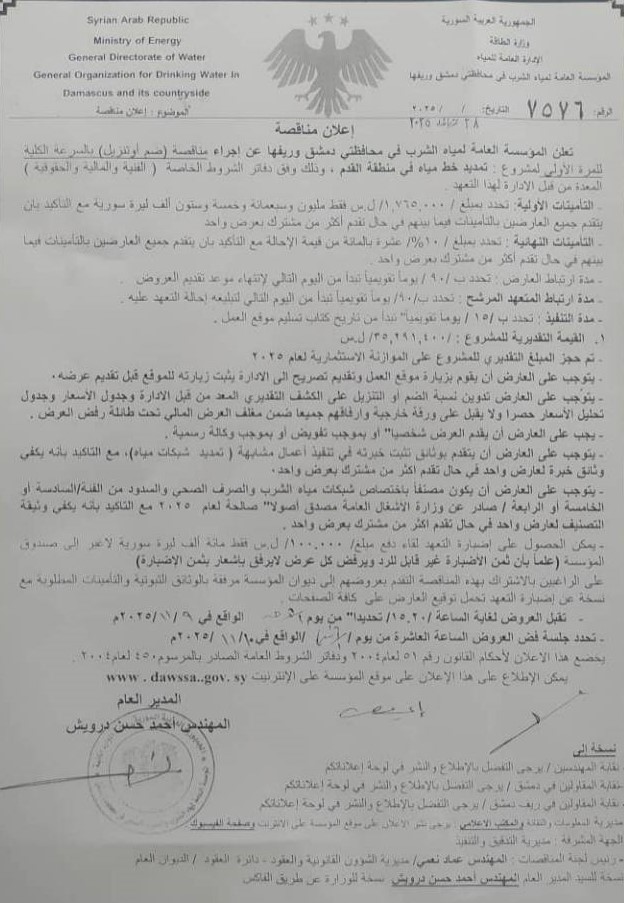 1- مناقصة (ضم أو تنزيل) للمرة الأولى بالسرعة الكلية لمشروع: تمديد خط مياه في منطقة القدم. |