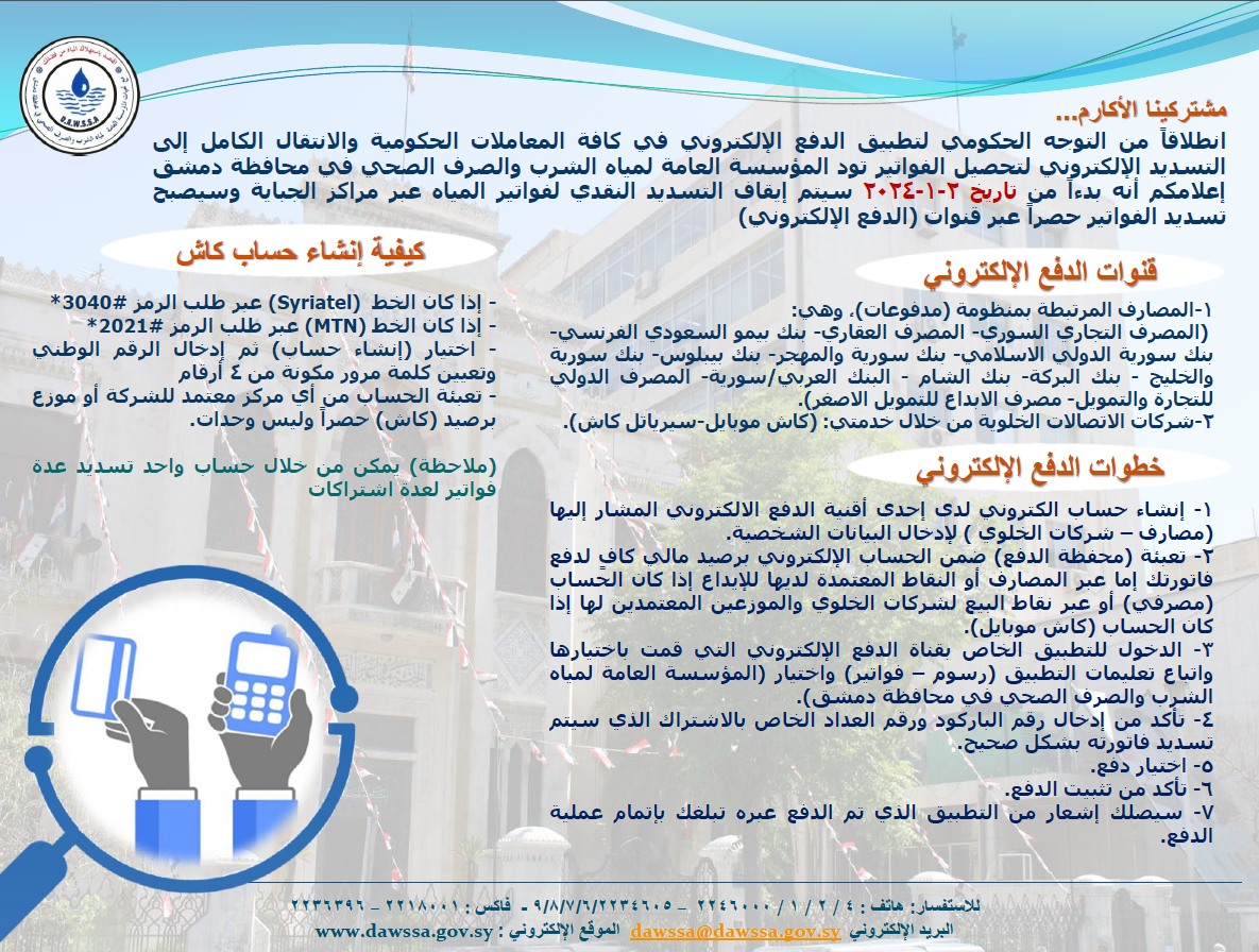 انطلاقاً من التوجه الحكومي لتطبيق الدفع الإلكتروني في كافة المعاملات الحكومية والانتقال الكامل إلى التسديد الإلكتروني لتحصيل الفواتير تود المؤسسة العامة لمياه الشرب والصرف الصحي في محافظة دمشق إعلامكم أنه بدءاً من تاريخ 2-1-2024 سيتم إيقاف التسديد النقدي لفواتير المياه عبر مراكز الجباية وسيصبح تسديد الفواتير حصراً عبر قنوات (الدفع الإلكتروني)