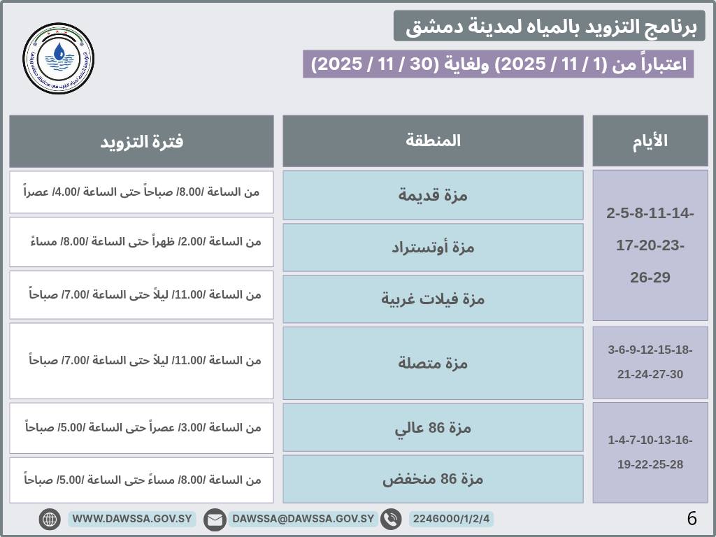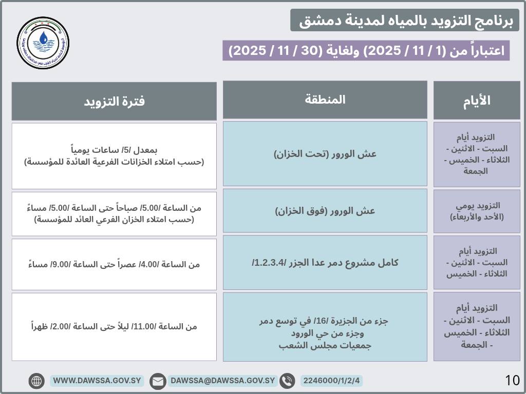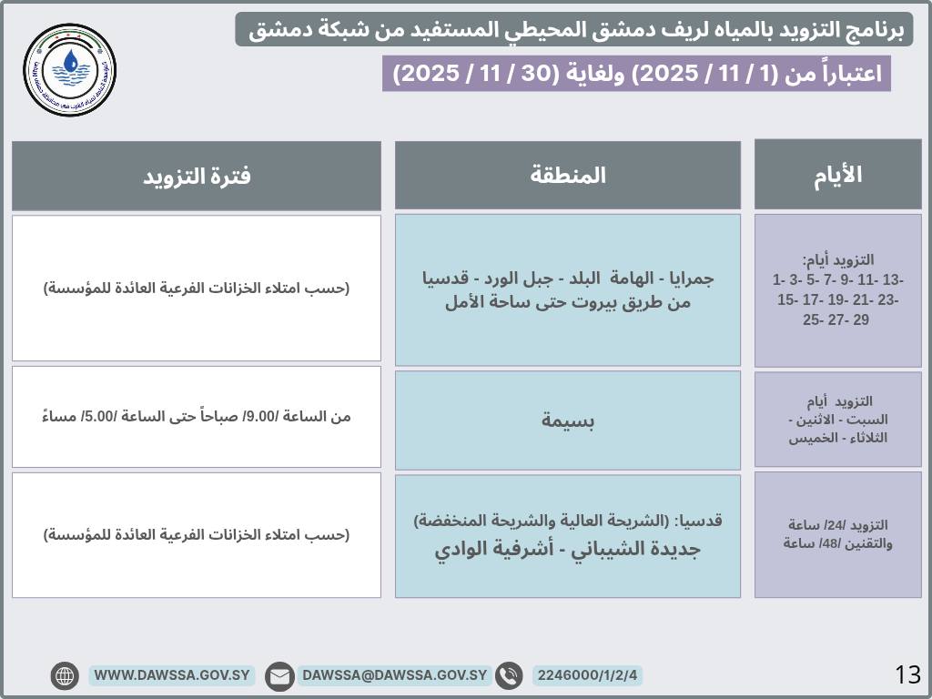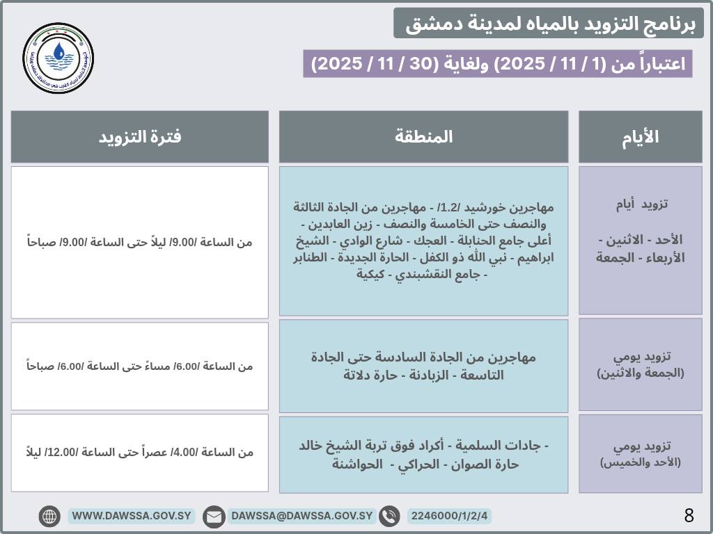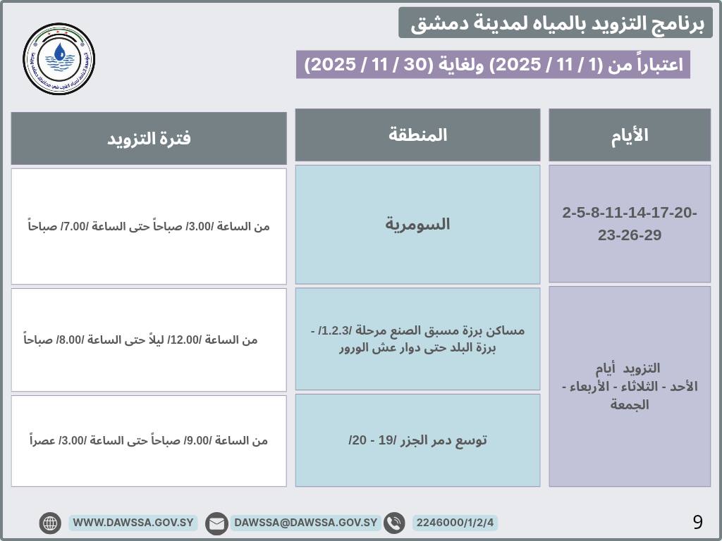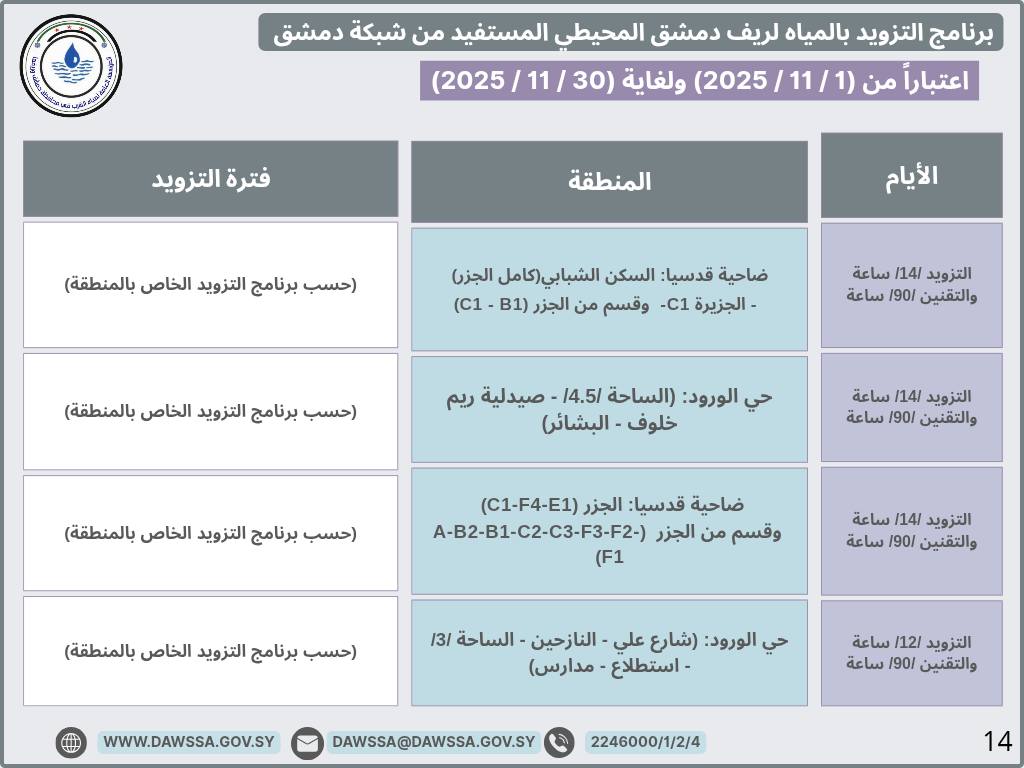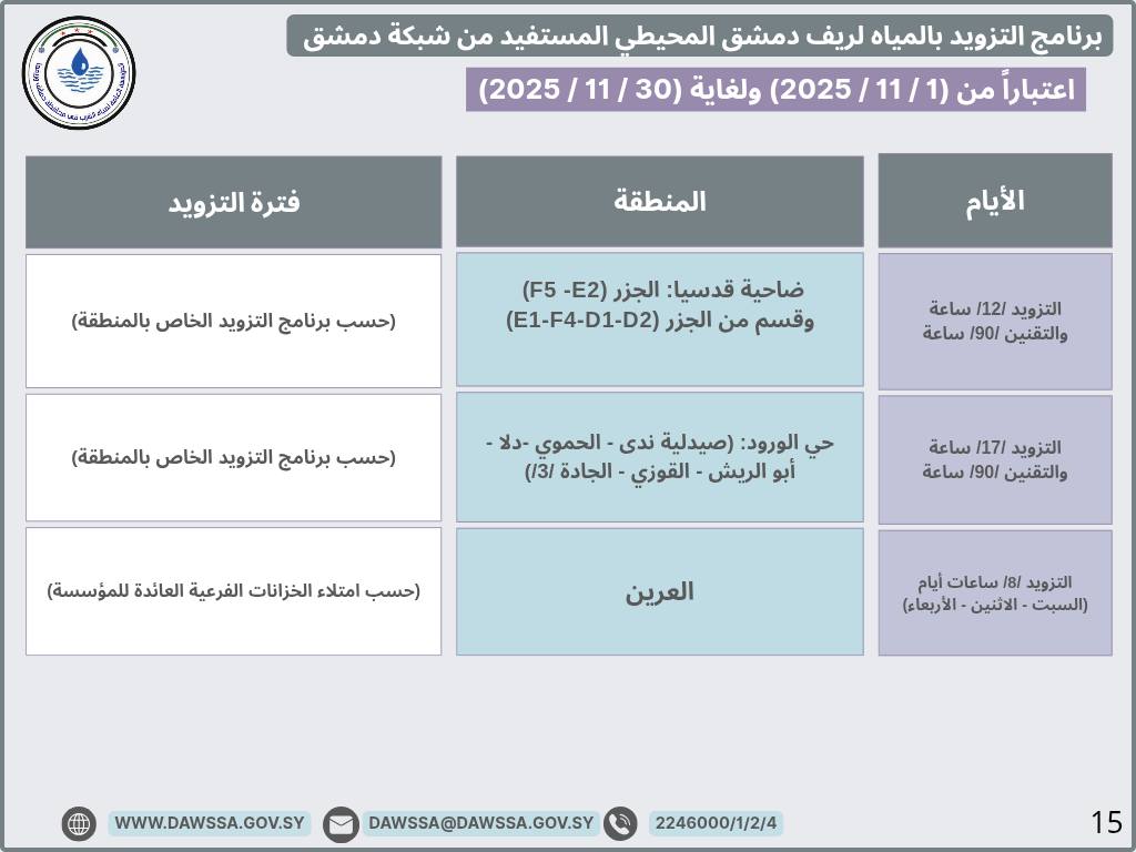 برنامج التزويد بالمياه لريف دمشق اعتباراً من 2025/10/1 ولغاية 2025/10/31