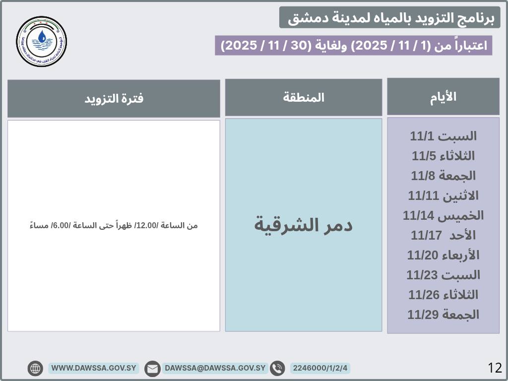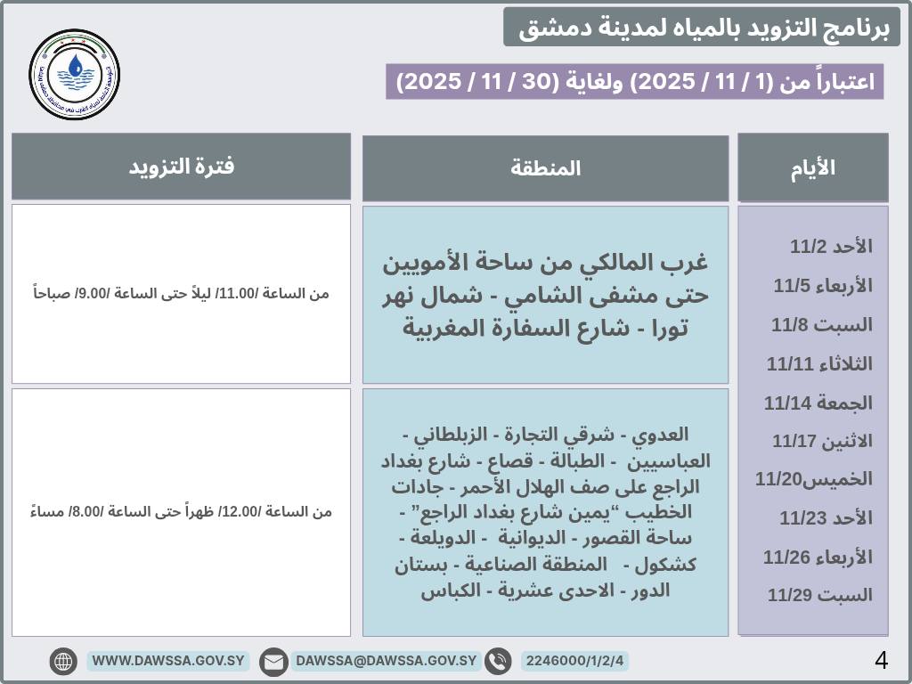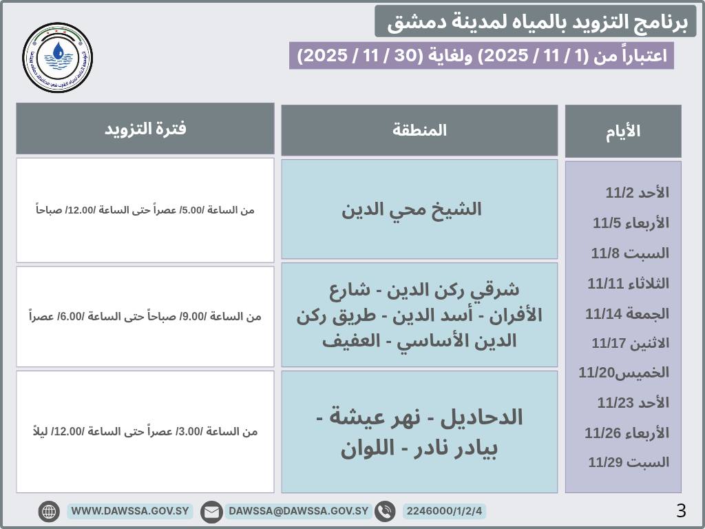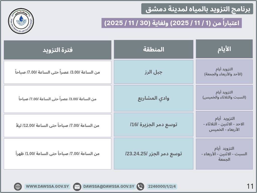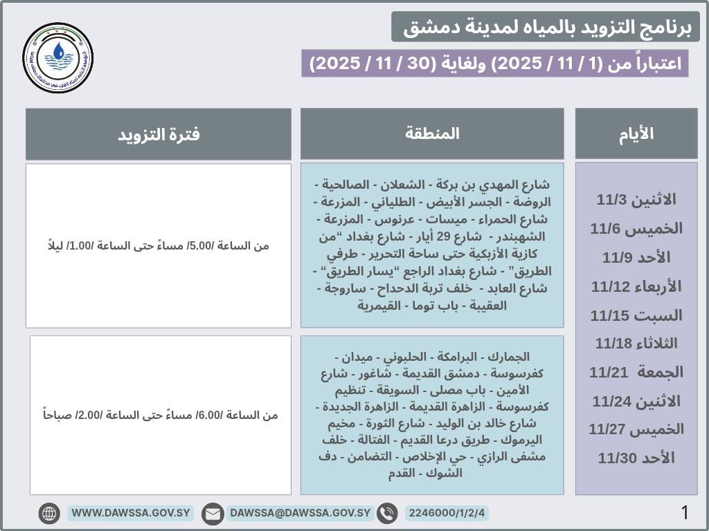 برنامج التزويد بالمياه لمدينة دمشق خلال شهر تشرين الثاني 2025