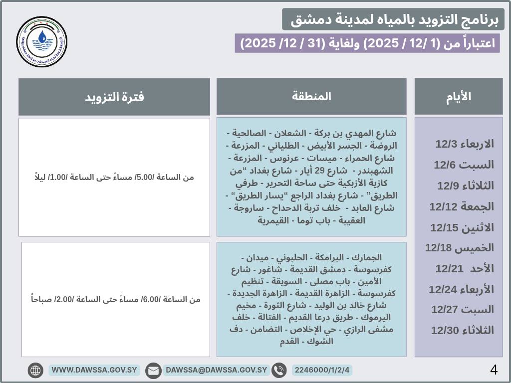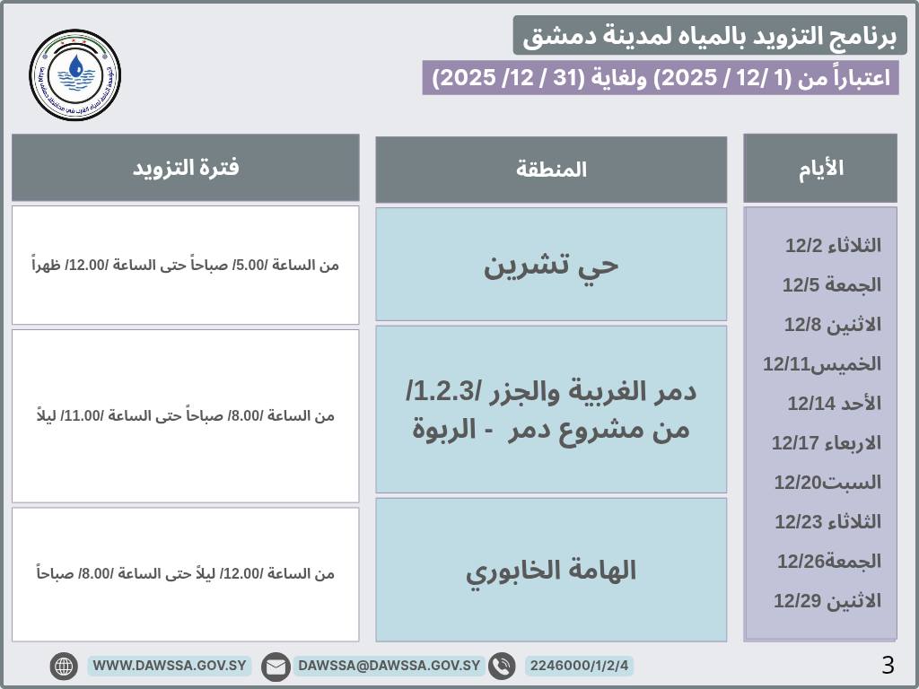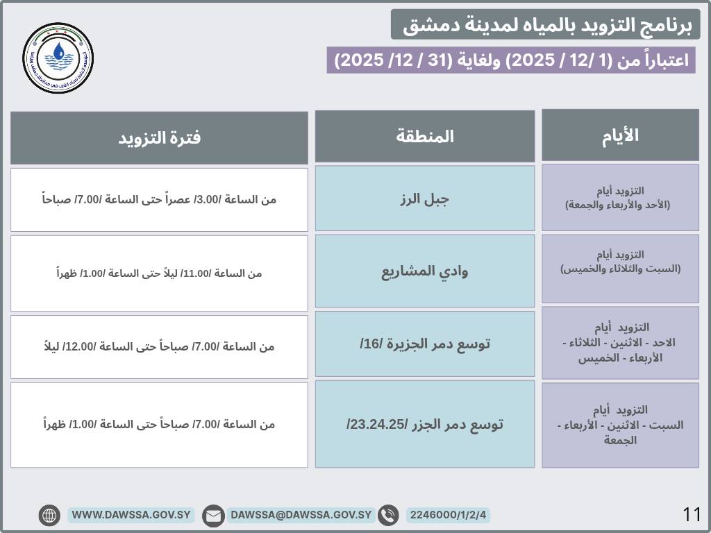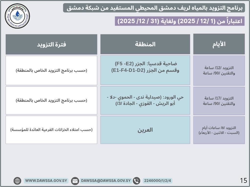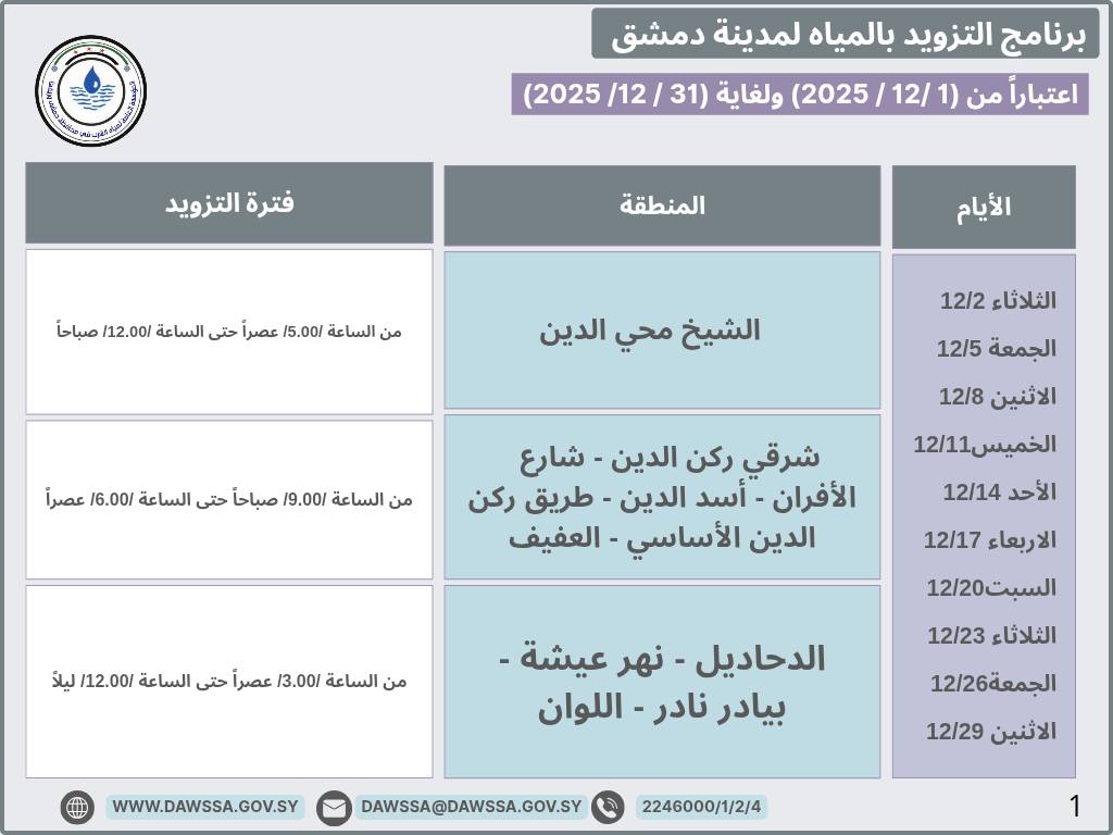 برنامج التزويد بالمياه لمدينة دمشق خلال شهر كانون الأول 2025