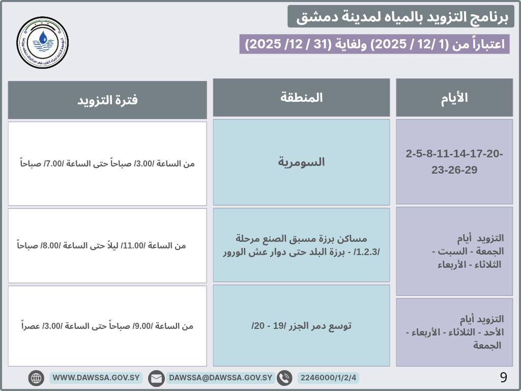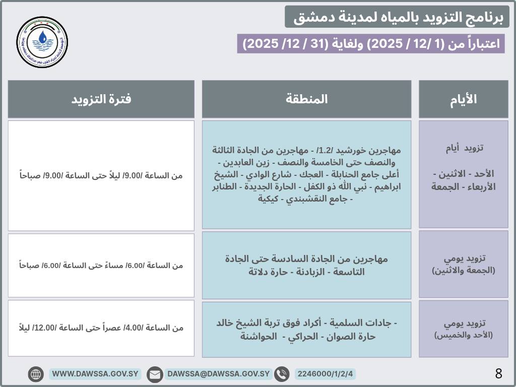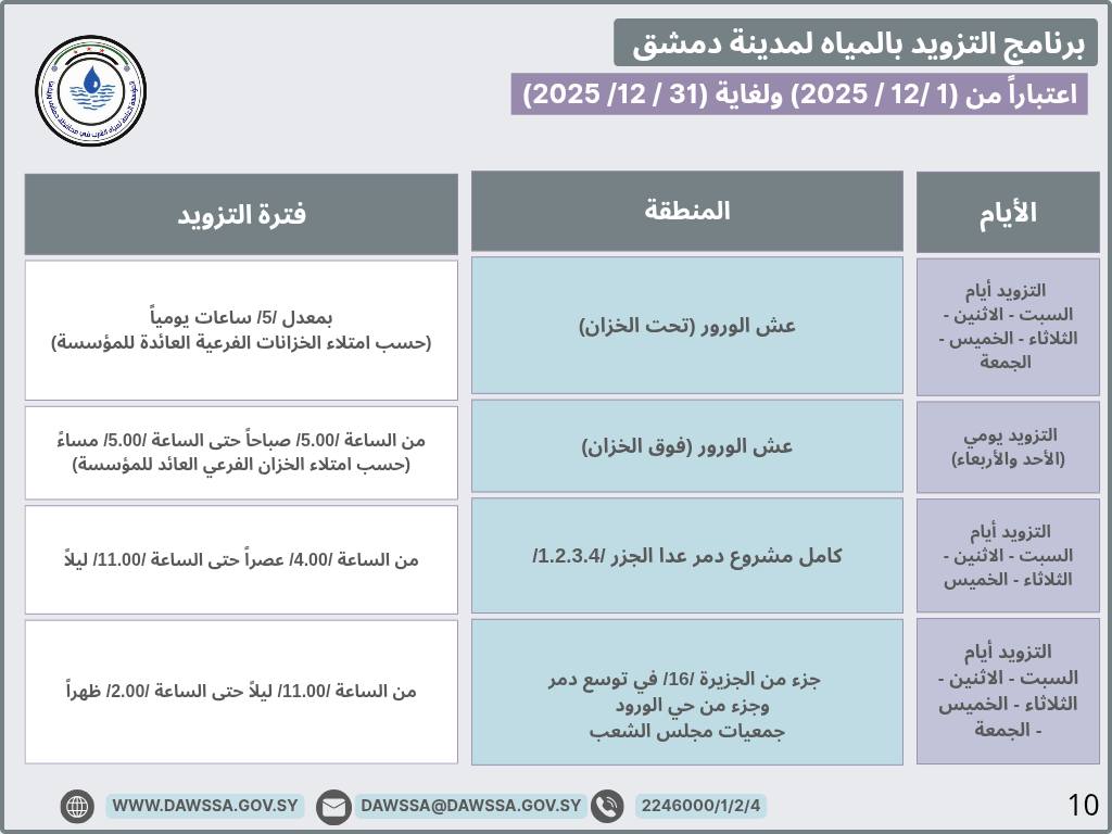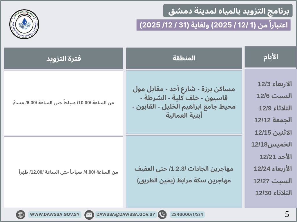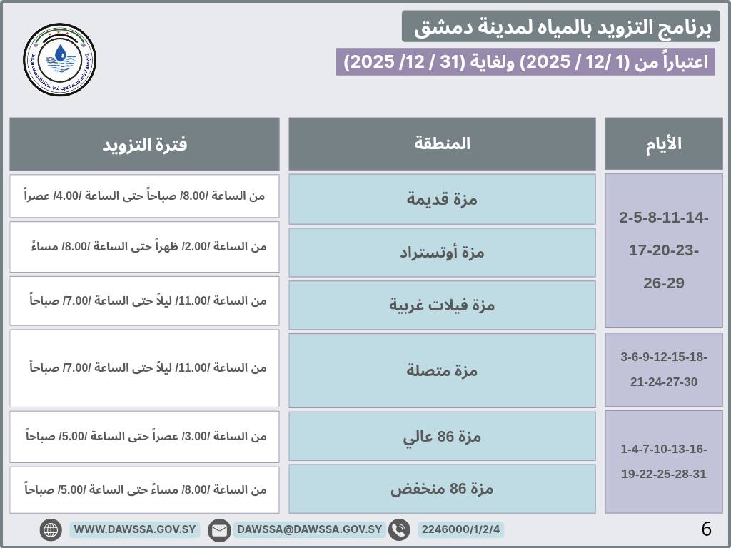 برنامج التزويد بالمياه لمدينة دمشق خلال شهر كانون الأول 2025