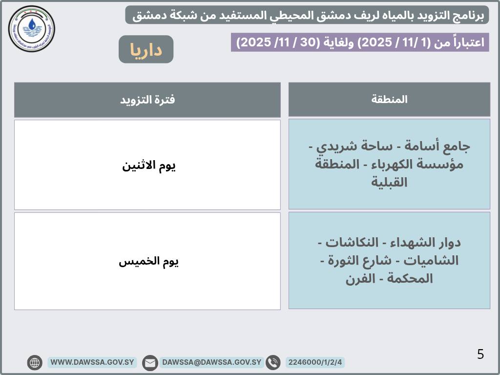 برنامج التزويد بالمياه لريف دمشق اعتباراً من 2025/10/1 ولغاية 2025/10/31